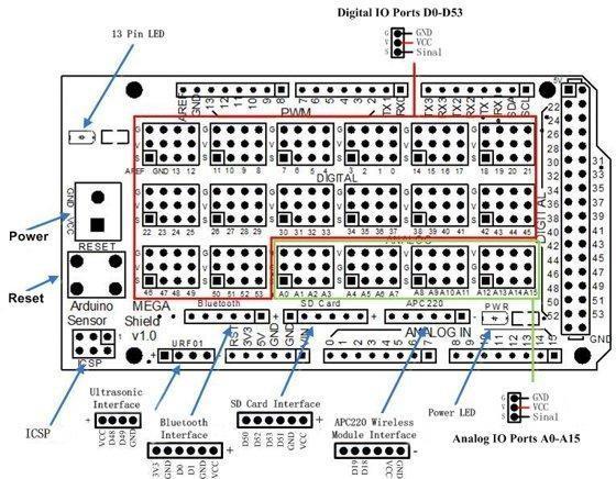 Mega Sensor Shield V2.0 pinout all of the digital and analog interface